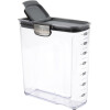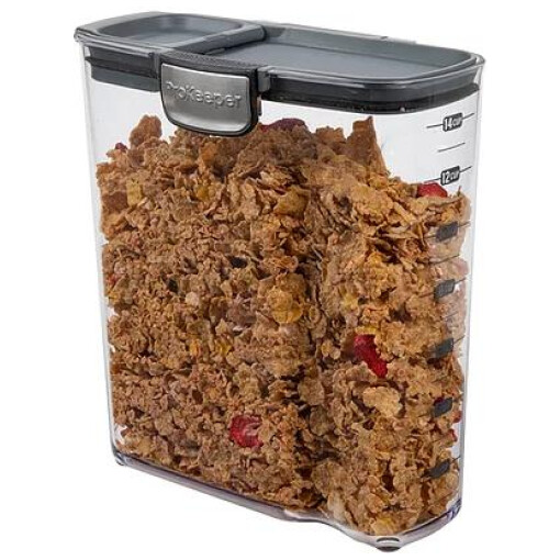 The Progressive Cereal ProKeeper Plus storage container stores and measures cereal worry-free and mess-free. The clear container features a wide mouth pour spout to dispenses a wide range of cereals easily, a silicone gasket seal, and a stainless steel easy-lift latch and a secure side grip. Dishwasher safe.