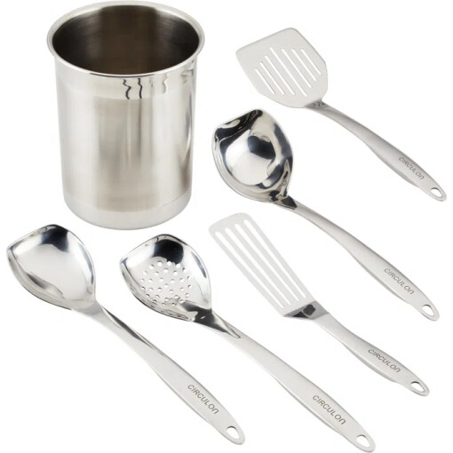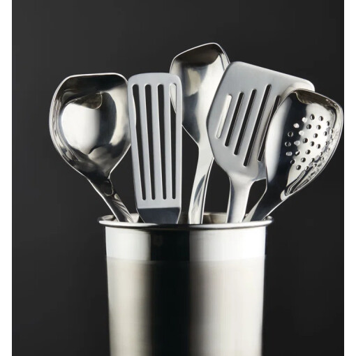 WHAT YOU GET: Set of essential cooking utensils includes a 13 in. ladle,13 in. solid spoon,13 in. slotted spoon,13 in. slotted turner, 2 in. x 5 in. fish turner, and a stylish stainless steel tool crock for smart countertop storage