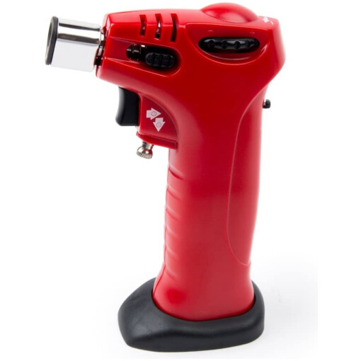 It’s constructed of plastic and steel for durability and includes safety switches: child-lock and flame-lock, easy one-hand operation with button to light. The adjustable flame, allows the perfect amount of browning desired; Powered with butane gas (not included). Small size allows for easy, compact storage.
