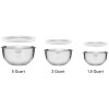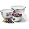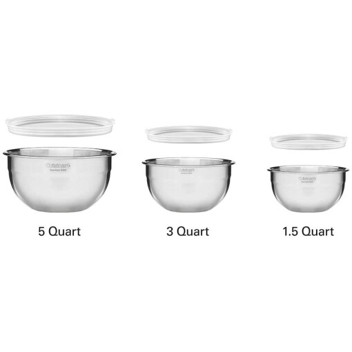The Cuisinart set of stainless steel mixing bowls come in a set of three with tight-fitting lids for storage. The 1.5 qt, 3 qt, and 5 qt bowls are all refrigerator- and freezer-safe, and dishwasher safe for easy cleanup!