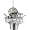 Set includes 2.5 qt. saucepan with cover, 3.5 qt. sauté pan with helper handle and cover, 6 qt. stockpot with cover, 8″ skillet, 10″ skillet, lid organizer, bamboo slotted spoon, bamboo slotted turner and bamboo solid spoon.