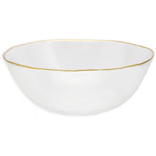 This salad bowl was constructed out of fine glass material and decorated with a bold gold trim. Its beautiful shape, size, and design makes it ideal for every occasion. Whether you choose to display it by itself or to combind it with its expanded collection, this bowl will truly enhance your table setting. Dimentions: 8.5″D