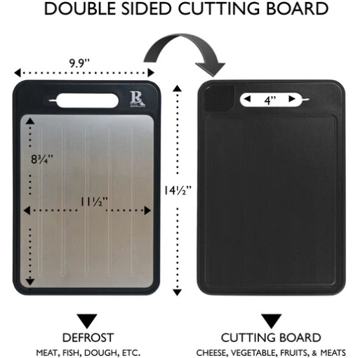 | DEFROST TRAY | Thaw 50% faster with our premium aluminum alloy defrost tray. This reverse side of the tray is a handy gadget to thaw frozen foods in half the time. Do not use it for cutting |