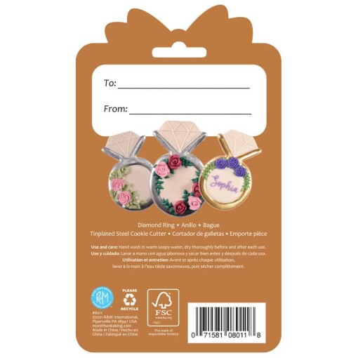 Diamond Ring 3.75″ cookie cutter is made of high-quality tinplated steel. Packaged on a colorful card featuring cookie designs on the front and back for decorating inspiration. Makes a great gift for special occasions with space on the back for personalized gift greetings. Hand wash and dry thoroughly before and after each use.
