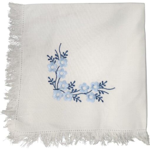 Add a touch of artisanal charm to your table with these beautiful stitched napkins. Featuring delicate blue floral embroidery and hand-finished fringe edges, this napkin combines elegance with a hint of whimsy. soft, Enhance your place settings with this beautifully crafted, uniquely detailed blue napkin.