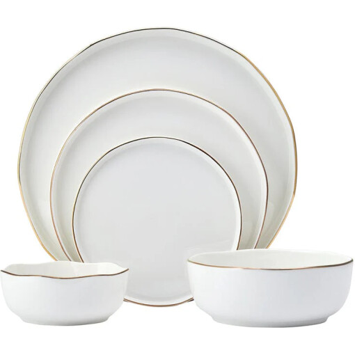 The Adelaide Gold Dinnerware Set brings a distinctly modern twist to your table with its elegant, organic design. Each round piece features a gently curved rim accented by a unique gold band, adding a touch of sophistication to every setting. With plates showcasing raised sides for added depth and style, this collection effortlessly blends contemporary flair with timeless elegance perfect for both everyday dining and special occasions.