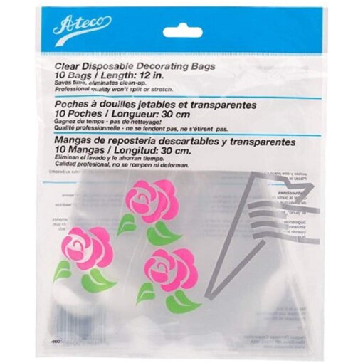 These soft clear disposable decorating bags by Ateco are made of pliable, flexible polyethylene material. These flexible piping bags are great for working with royal icings and buttercreams. Works together with couplers, and decorating tips. Bags are 12″ long.