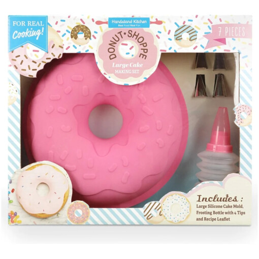Includes: 1 large silicone donut cake mold, 1 frosting bottle with 4 tips and recipe leaflet.