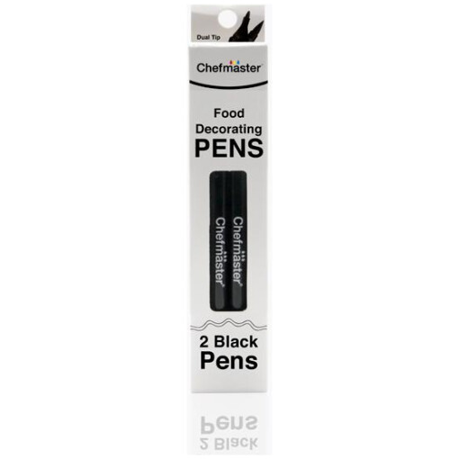 Food Decorating Pens from Chefmaster® allow you to express your creativity in new ways. Whether you are decorating cupcakes, cookies, or a cake, an edible marker makes personalizing baked goods as easy as drawing on paper. Our food coloring pens offer a mess-free and straightforward way for you to enhance the look of your desserts. Our edible markers are an excellent way to introduce your kids into the joys of baking. This kit is composed of 2 black tips pen with double tips. The thicker nib is perfect for filling in large areas of color quickly, while the smaller nib on the other end is ideal for writing messages or drawing detailed pictures. Both professional pastry chefs and home cooks love Chefmaster® food coloring pens are for their vibrant and consistent appearance which resists fading over time so your creations will always look amazing.