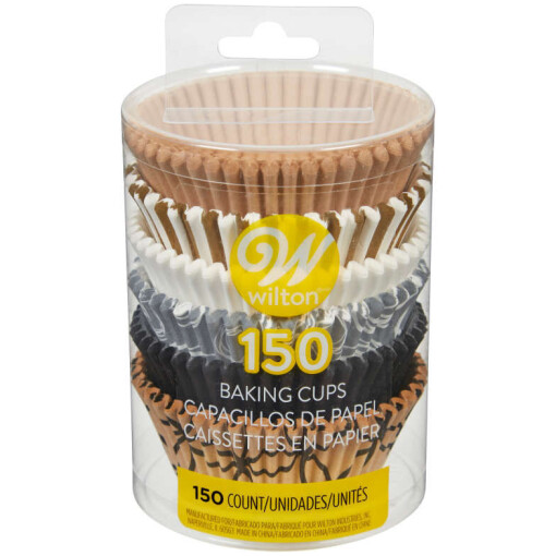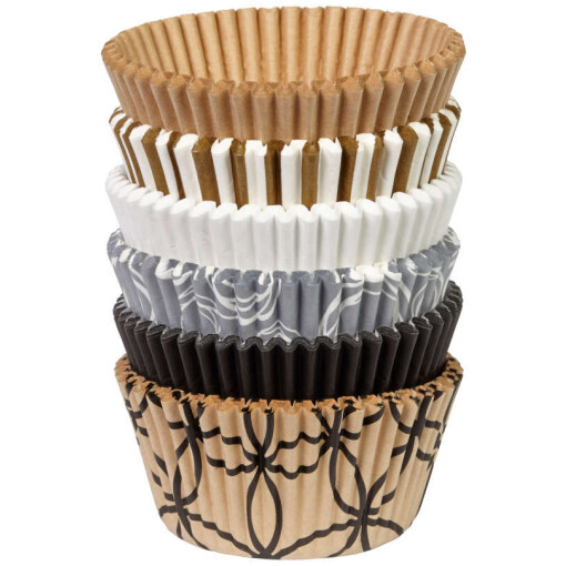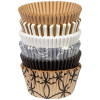 Make cupcakes for wedding or anniversary celebrations with these elegant baking cups. Includes 25 of each design: gold, white and gold stripes, white, white and silver scripted, black, black and gold floral. Can also hold nuts or candies.