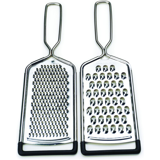 This set of 2 hand-held graters from RSVP International has a non-skid edge and 4″ long handles. Made from dishwasher safe 18/8 stainless steel with 2-1/4″ x 4-1/2″ grating surfaces and 10″ overall length.