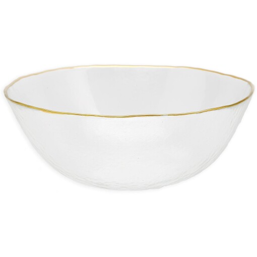 This salad bowl was constructed out of fine glass material and decorated with a bold gold trim. Its beautiful shape, size, and design makes it ideal for every occasion. Whether you choose to display it by itself or to combined it with its expanded collection, this bowl will truly enhance your table setting.