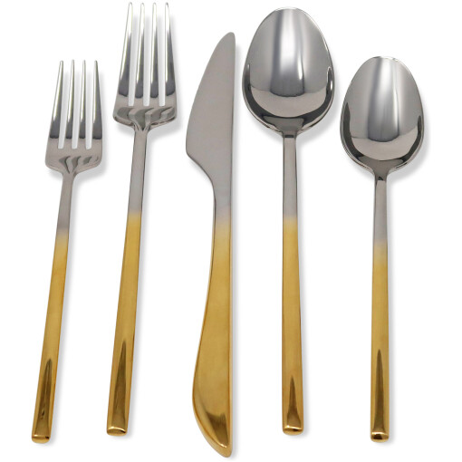 This 20 piece flatware set is crafted from 18/10 stainless steel with silver finish and has graduated gold handles for a stylish touch. Perfect for four settings, the set contains 4 of each: dinner forks, salad forks, dinner knives, dinner spoons, and salad spoons. This quality flatware is both beautiful and durable. Its bold design is sure to make a statement at any gathering.