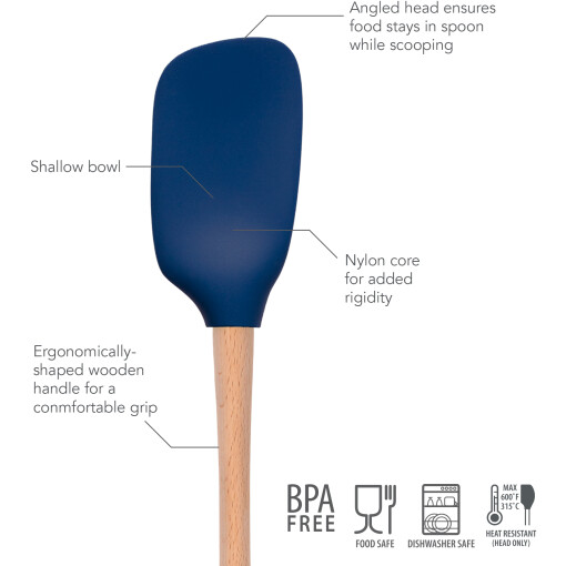 This wood handled spatula by Tovolo is perfect for mixing, folding, serving, spreading, scraping, and flipping. The edges are tapered to a sharp point to scrape sides clean and it features a completely smooth surface for even spreading. The spatula also has a Nylon Core for added rigidity and an ergonomically shaped handle for a comfortable grip. Dishwasher safe head.