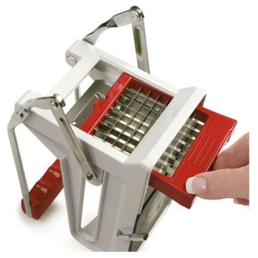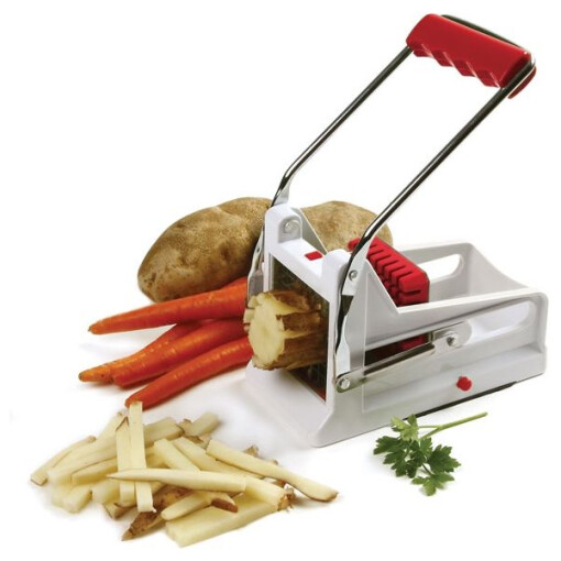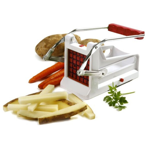 Do you want restaurant style fries in the comfort of your home?!?! This French Fry Cutter from Norpro will do the trick! It’s designed to cut and slice potatoes into restaurant style fries without going out. The suction base keeps the cutter stable while in use. Includes two cutting sections with 36 and 64 holes and two pusher plates. Also works with other vegetables.