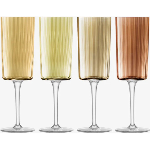 A set of textured flutes with casual stems and fine walls, painted by hand in an assortment of tonal amber colours. For serving prosecco, champagne or sparkling cocktails.