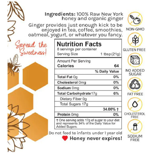 - ORGANIC GINGER – The flavor has a kick and the ginger doesn’t get lost in the honey (if you love ginger, you’ll love the organic ginger honey!)