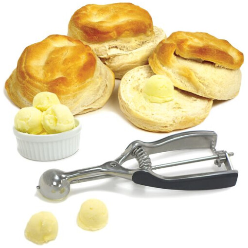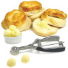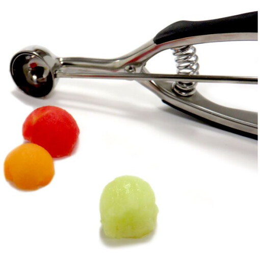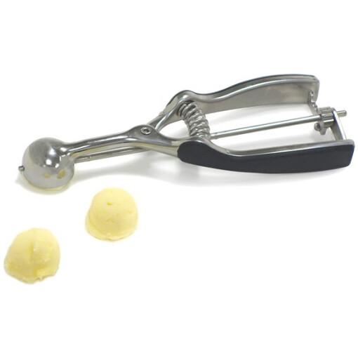 Spring action, this stainless steel Grip EZ Scoop, by Norpro, is designed with Santoprene, soft grip handles. Ideal for scooping ice cream, scoop and drop cookie dough or cake pops, use as a meatballer, fruit and melon baller.