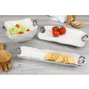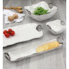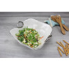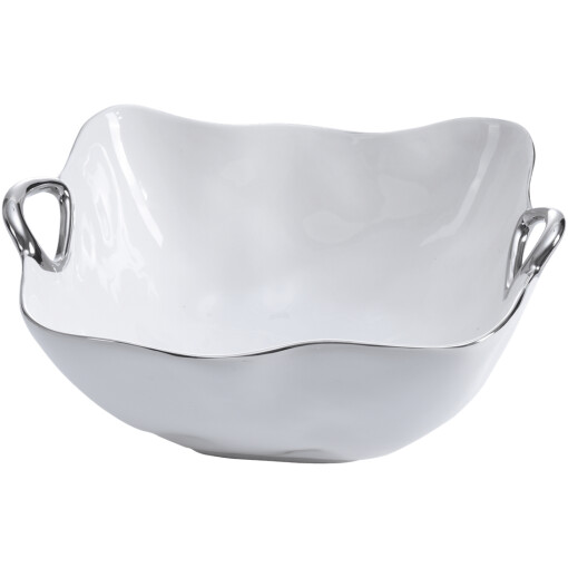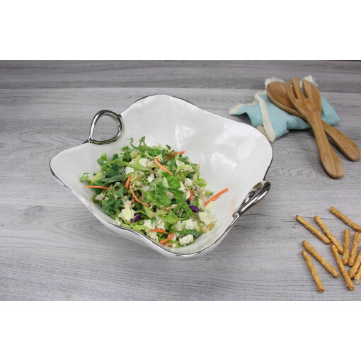 Large Bowl in Handle with Style. Generously sized bowl for serving salads, pastas or side dishes. Stunning white porcelain with smooth and fluent handles in silver titanium. Food safe, dishwasher safe, oven safe to 350°. Easy Care.