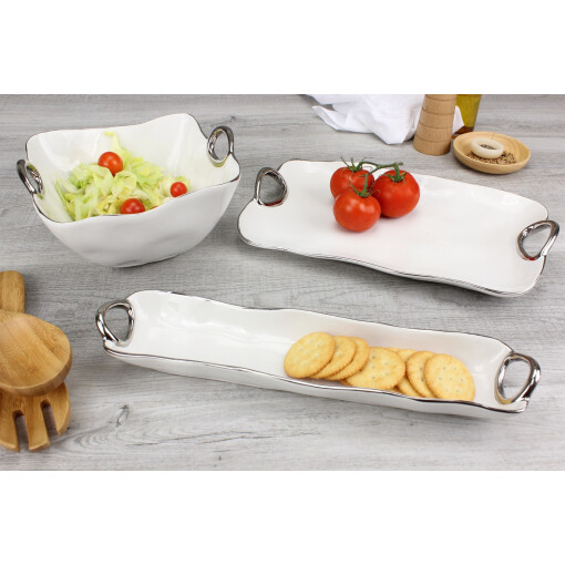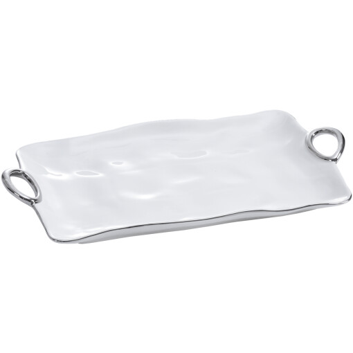 Large Platter in Handle with Style. In casual and formal settings, this tray can be used to serve the main course, your favorite grilled vegetables or even dessert! Stunning white porcelain with smooth and fluent handles in silver titanium. Food safe, dishwasher safe, oven safe to 350°. Easy Care.