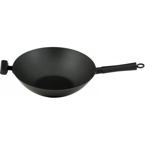 This excalibur nonstick stir fry pan is crafted from 2 mm carbon steel for quick heat up and cool down. The wok is coated with excalibur nonstick surface for easy food release and cleanup. The riveted Bakelite handle and helper handle stays cool on the stovetop and it sits securely on gas, electric, and induction stovetops. Hand wash.