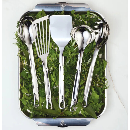 The 5 Piece Essential Tool Set features exquisitely crafted stainless steel utensils, including a Solid Spoon, Ladle, Pasta Fork, Turner, and Fish Spatula. Each tool offers supreme comfort and precision detailing to meet the demands of a Michelin-star chef and the discerning home cook. This chef-curated selection of must haves combines function and sophistication to create the last tool set you’ll ever need.