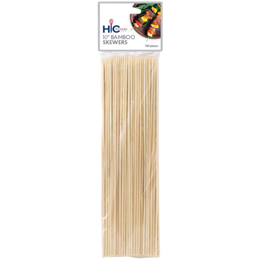 HIC’s Bamboo Skewers for preparing, cooking, and serving appetizers, entrees, desserts, craft cocktails, and more. Made from all-natural bamboo; strong, durable and eco-friendly; food safe, oven safe and flame safe when pre-soaked in water. Bamboo securely grips food and seals stuffed foods; pointed tip makes loading foods easier; won’t transfer heat to hands or scratch surfaces. Easy to use; simply pierce food with pointed end, slide food to the center, cook or serve; for grilling, roasting, broiling, baking, and more. Includes 100 bamboo skewers; easy to use; won’t melt like plastic skewers; disposable for easy cleanup.