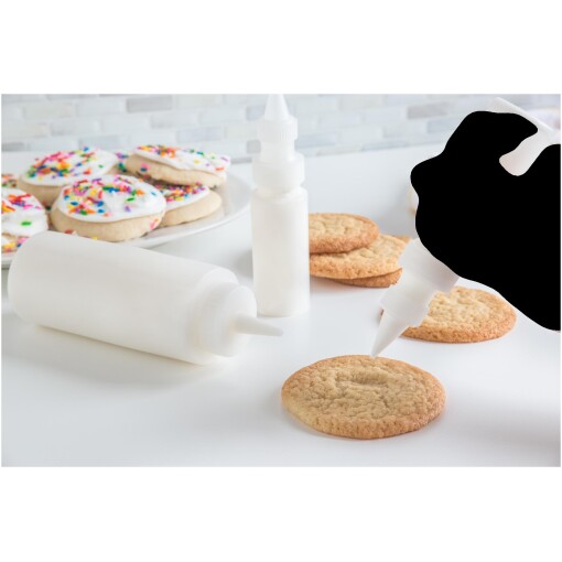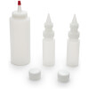 Set of 3 Bottles with tips and couplers by Fox Run. The two small bottles each hold 2 ounces and the large bottle holds 10 ounces. These bottles are great for decorating cookies, cupcakes, cakes and more. It is easy to squeeze, making it great for dispensing icing, frosting, and chocolate. Features a round opening squeeze tip perfect for flowers, swirls, or messages.