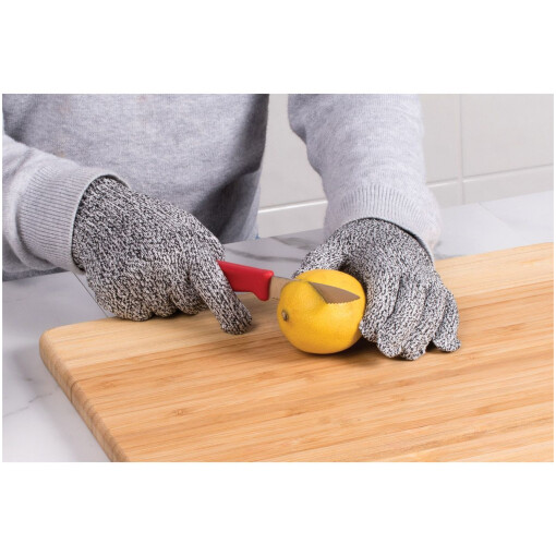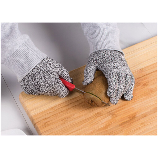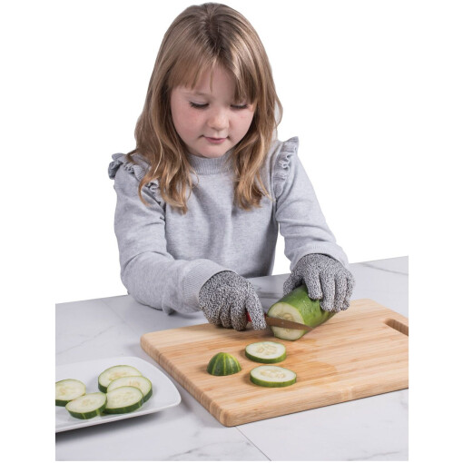 Cutlery Pro’s Kid’s’ Cut-Resistant Gloves offer Level 5 protection against sharp and abrasive edges with complete control, dexterity, a secure grip. Made from HPPE (high performance polyethylene), with basalt fiber and spandex; strong, lightweight, breathable; safe for direct food contact. Protects small hands, fingers and wrists in the kitchen, workshop, garage, and yard; allows comfortable, confident use for both hands. Protection from kitchen knives, mandolines, mezzaluna blades, vegetable and cheese graters, knives, and more. European LFGB food-safe certified; flexible and comfortable; does not protect against punctures; hand wash in cold water and hang dry.