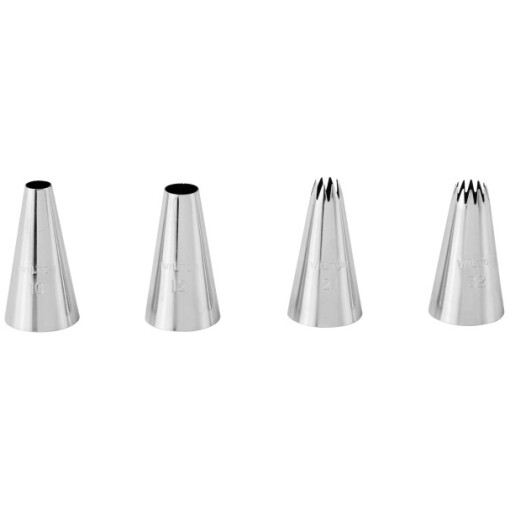 Do you love making big and bold cake decorations? This 4-piece decorating tip set is for you! It includes 4 large piping tips that are great for making large swirls, shells, stars, dots and more. With 2 large round tips and 2 large star tips, you’ve got many decorating options in one small set.