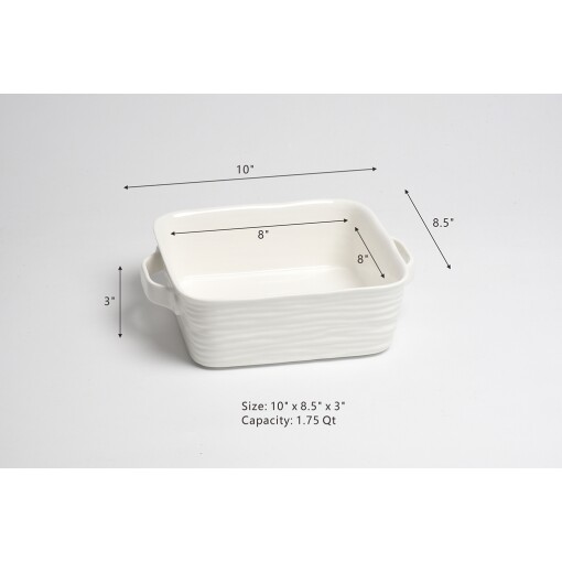 8″ x 8″ Square Baking Dish in Le Blanc. Impress with your culinary skill and presentation by serving up delicious entrees or pastries in this elegant dish. Versatile high-fired porcelain pieces that are microwave safe! Beautifully crafted with clean lines and organic shapes. Food safe, tarnish free, dishwasher safe, oven safe to 500°. Easy Care. Capacity: 1.75 qt