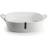 Description: Round, white, ceramic casserole baker. Embossed with a subtle linen pattern. A classic piece with a modern touch!