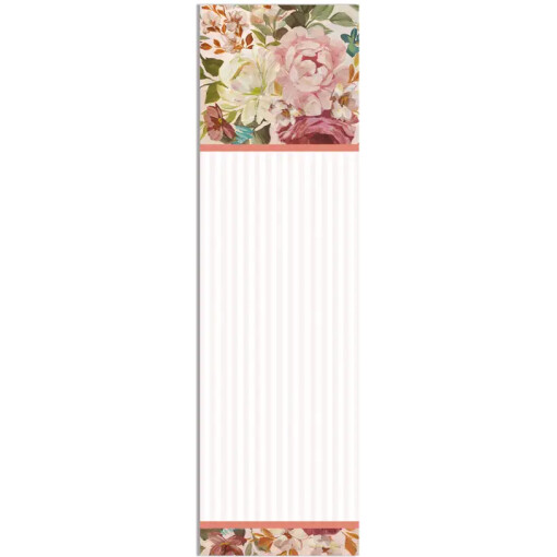 A list notepad displaying colorful designs of cabbage roses with a decorative space to write notes. Cabbage rose designs are replicated from original artwork hand painted in a unique watercolor style. This pad includes 60 pages and a strong magnet to easily hang on magnetic surface for display. A stylish accessory perfect for adding functional style to any space.
