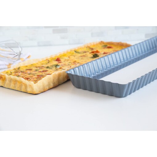 This Non-stick Long Tart Pan with Removeable Bottom is great for making, tarts, quiche, casseroles, entrees, desserts, and other favorite recipes. It’s removable base pops out of the pan to serve food easily; great for quiche, mac and cheese, shepherds pie, pot pies, apple pies, tarts, tortes and more. Non-stick to release foods quickly; no stuck-on, baked-on mess!