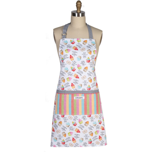 It’s a baker’s sweet dream with this confectionary textile assortment, sure to add a huge helping of personality to kitchen decor! Full coverage and durable chef apron features large and convenient front pocket with “master baker” detail. Adjustable & machine washable.
