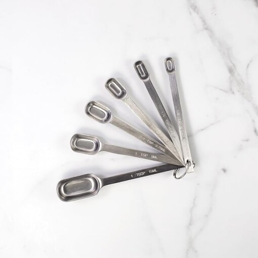 - et of 6 standard kitchen measurements includes ⅛, ¼, ½, ¾, and 1-teaspoon plus 1-tablespoon; measuring spoons nest for easy compact storage