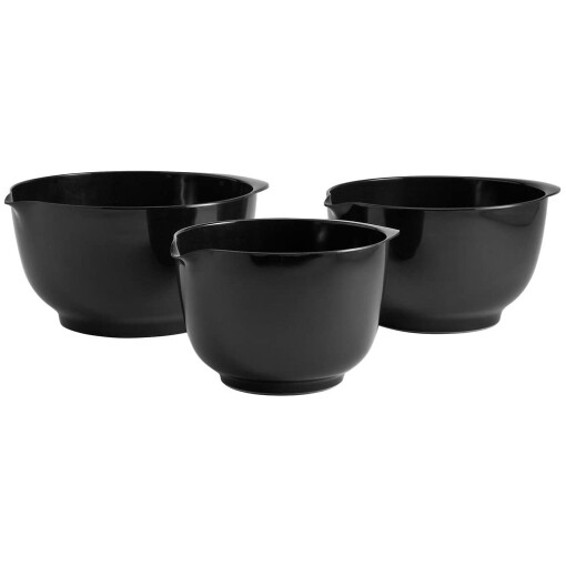 This Melamine Bowl Set by Gourmac comes with 3 mixing bowls: 1.5 qt, 2.5 qt, and 4 qt. The mixing bowls have a rubber ring on the bottom for a non-skid base, and a pouring spout. The mixing bowls are strong and durable, heat resistant up to 360 degrees, and are dishwasher safe.