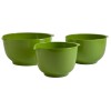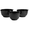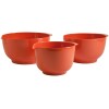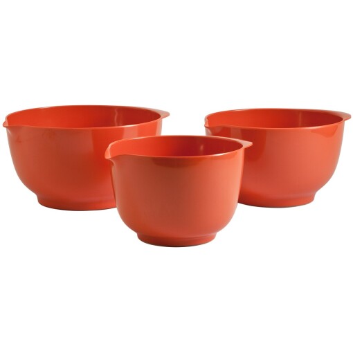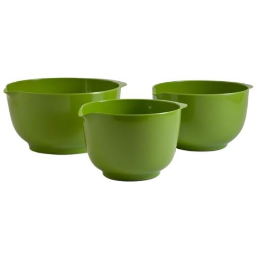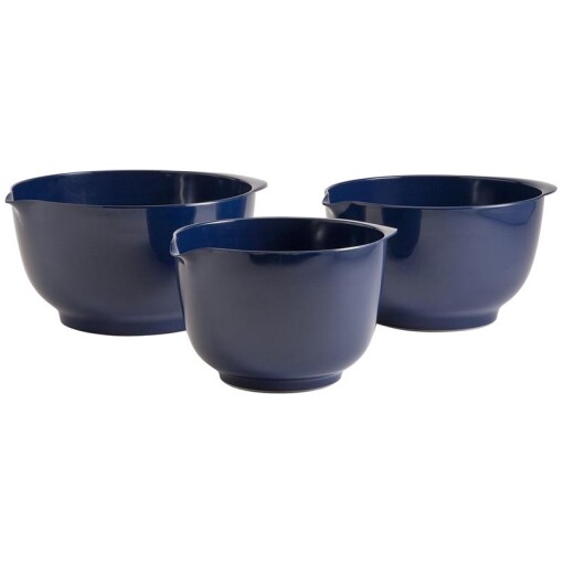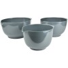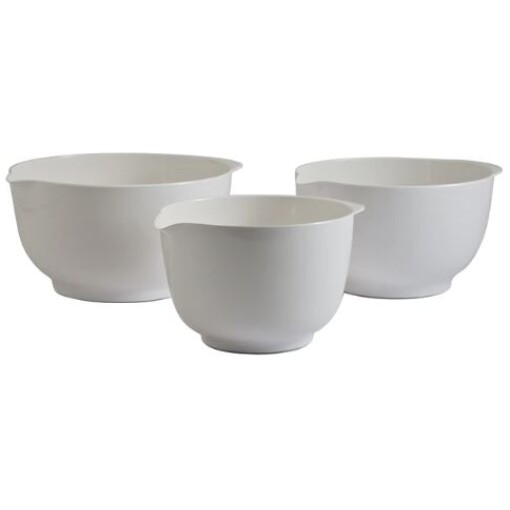This Melamine Bowl Set by Gourmac comes with 3 mixing bowls: 1.5 qt, 2.5 qt, and 4 qt. The mixing bowls have a rubber ring on the bottom for a non-skid base, and a pouring spout. The mixing bowls are strong and durable, heat resistant up to 360 degrees, and are dishwasher safe.