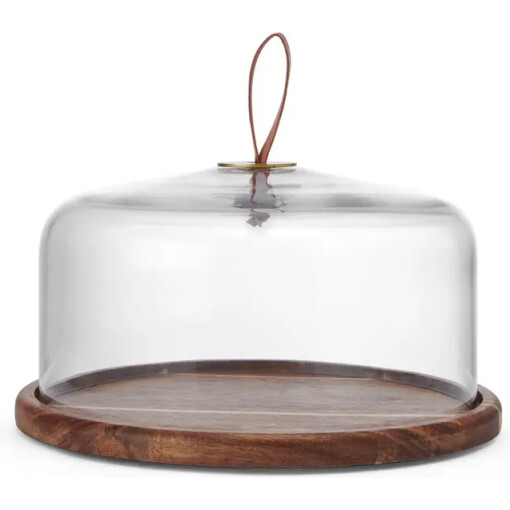 Combining clear glass with an acacia wood base, this elegant Glenwood Cake Dome brings contemporary style to any gathering. Ideal for elevating the presentation of cakes, pies, cookies, appetizers, and more, This eye-catching plate is perfect for protecting food from the air when serving guests. A faux leather loop on top makes removing the dome easy.