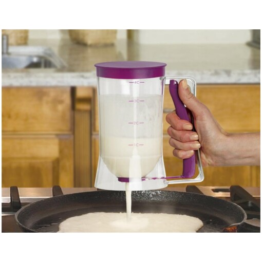 This Batter Dispenser by Harold Imports releases any pourable batter directly where it’s needed, without the drippy mess. |Made from BPA-free plastic with easy-to-read measurements printed right on the canister. Its wide-mouth opening makes filling easy and the built-in stand holds excess batter aside without drips while the first batch cooks.