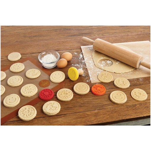 Mrs. Anderson’s Baking Non-stick Silicone Cookie Stamp Set embosses detailed designs for decorative cookies, shortbread, and fondant in just seconds. Made from silicone with wood handle; each stamp cover measures 2.4-inches; wood stamper handle measures 1 x 2.5-inches. Stamp designs include Smiley Face (yellow), Home Made (orange), and Made with Love (red); simply roll out dough or fondant then emboss the design. Non-stick silicone releases from the stickiest dough recipes easily; great for embossing cookies and pie crust, fondant for cakes, cupcakes, and more. Silicone stamp covers are dishwasher safe for easy cleanup; hand wash wood handle and dry thoroughly.
