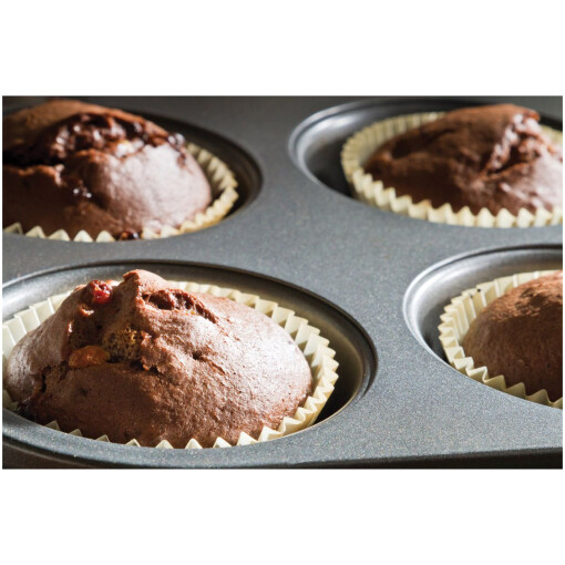 Mrs. Anderson’s 6-Cup Jumbo Muffin Baking Pan for making jumbo muffins, cupcakes, cheesecakes and coffeecakes with quick food release and easy cleanup. Professional-quality 0.5-millimeter carbon steel with premium quick-release, non-stick coating for uniform baking; PFOA-free, and FDA approved. Makes 6 jumbo-sized muffins; great for jumbo muffins, cupcakes, individual cheesecakes, coffeecakes, popovers, and more; instructions for use included. Non-stick to release food quickly; no stuck-on, baked-on mess; use wooden or nylon tools; never cut in the pan; heat safe to 450-degrees Fahrenheit. Reinforced beaded rim prevents warping and allows secure handling; easy non-stick cleanup; hand wash in warm, soapy water, dry thoroughly.