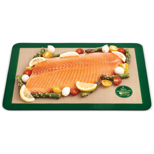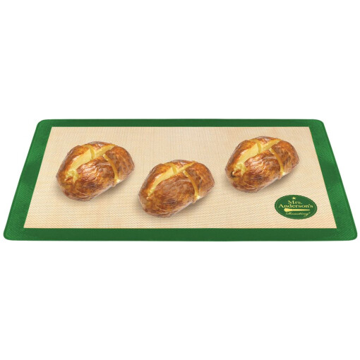Mrs. Anderson’s Non-Stick Silicone Baking Mats for baking cakes, breads, and pastries, plus roasting meats and cooking sweet and savory dishes. Made from silicone and natural glass fibers for even heat transfer; non stick for quick no-greasing release. Includes 2 color-coded mats for easy identification; use orange for baking and green for roasting meats and poultry and baking fish and savory foods. Non-porous surface eliminates worry of cross contamination of food; temperature safe for use in the oven and freezer (-40 to 480 degrees Fahrenheit). 11.625-inch x 16.5-inch; fit standard baking sheets; durable and reusable; more economical than using parchment paper; dishwasher safe.