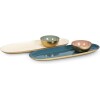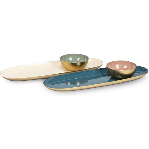 Transform your living space into a work of art with this Large Oval Enamel Tray. Crafted from metal with an eye-catching gold finish on the outside and a beautiful high-gloss enamel coating on its interiors in both denim blue and classic pearl, these trays are sure to turn heads and steal the show at any get-together or gathering.
