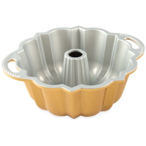 Try the smaller version of the classic 15 cup Anniversary Bundt Pan by Nordicware. This commercial-quality Anniversary Bundt pan by Nordicware produces an elegantly shaped cake that needs only a dusting of confectioners’ sugar for decoration. The pan is made of hat-responsive cast aluminum which promotes even rising, uniform baking and a golden crust. Nonstick interior ensures that cakes turn out perfectly every time and the side handles facilitate lifting the cake in and out of the oven. Pan measure 8″ diameter x 3.5″ tall.