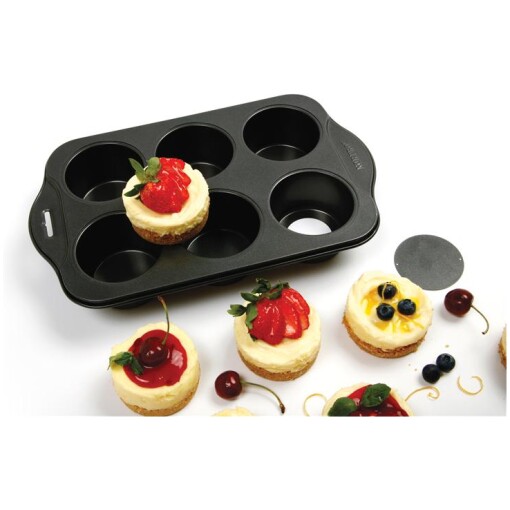This nonstick cheesecake pan by Norpro is great for quiches, tartlets, muffins, coffee cakes, hours d’ouveres and more. It features removable bottoms for easy removal and cleaning. The nonstick coating makes items easy to release and clean.