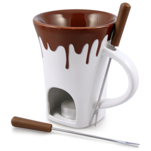 The Nostalgia 4 piece chocolate fondue mug set is a fun way to experience chocolate fondue. Set includes 270 ml/9 ounce ceramic mug with a built in tea light holder, tealight, and two forks. Great for dipping fruit, Lady Fingers, pound cake, crisp wafers, marshmallows, rice crispy treats, granola bars, and brownies.