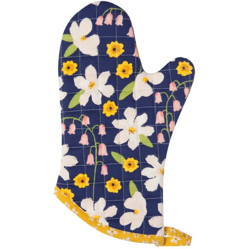 Fresh floral flowers thrive with this Full Bloom Chef mitt. Made from 100% cotton and lined with silver acrylic coated cotton, this mitt is 13-inches long and measures 6.5 inches from thumb to exterior side. The quilted construction with insulation also helps to protect your hands from the heat. Part of the Full Bloom collection, this design flourishes with daisies, and other garden favorites with a contemporary color palette of dusk blue, marigold, and coral. Dimensions: 13in Material: Outer: 100% Cotton Fill: 100% Polyester Care Instructions: Machine wash warm, tumble dry on low setting.