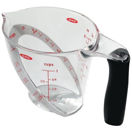 OXO has revolutionized liquid measuring with our Good Grips Angled Measuring Cups. A patented angled surface lets you read measurement markings by looking straight down into the Cup and eliminates the need to fill, check and adjust the amount of liquid yo