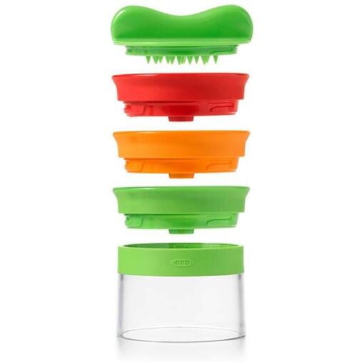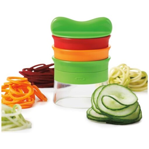 Create three different sizes of vegetable noodles in a snap with OXO’s 3-Blade Hand-Held Spiralizer. From zucchini “pasta” to beet salad to potatoes au gratin, these uniform spirals are easy to make, fun and delicious. This Spiralizer comes with interchangeable Spaghetti Cut (1/8-in), Fettuccine Cut (1/4-in) and Ribbon Cut blades that store on board. The open-blade design accommodates both long and round vegetables, and the food holder keeps hands safe and is easy to grip while turning down to the end of vegetables to minimize waste.